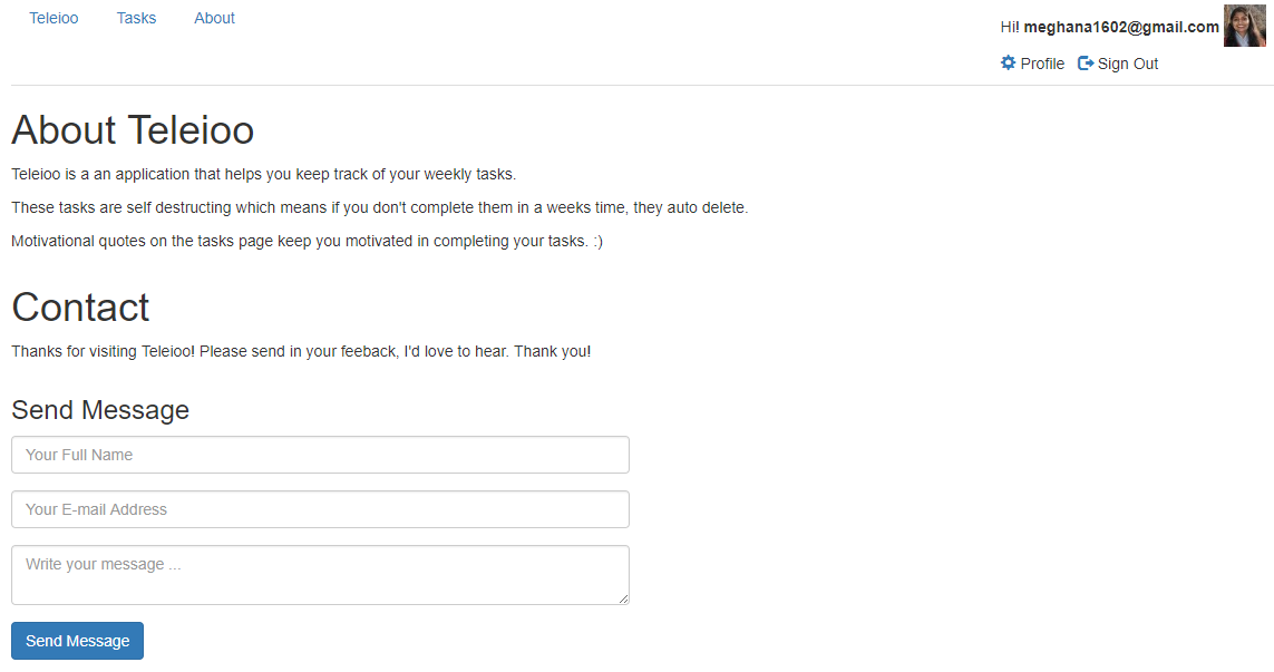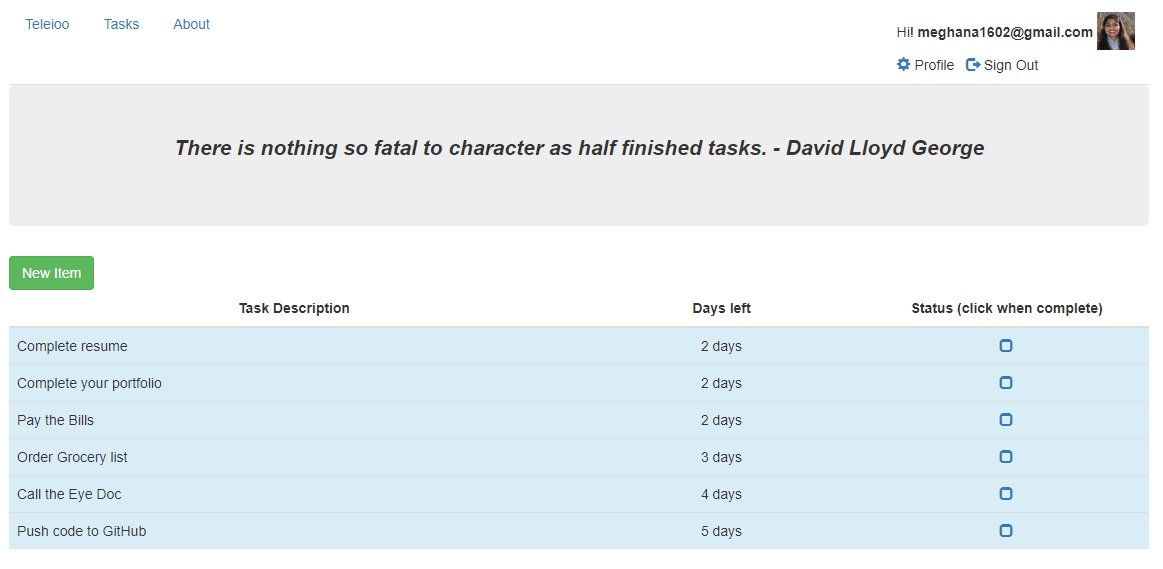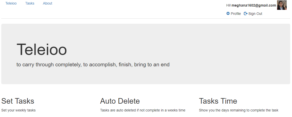 Teleioo which in Greek means to carry through completely, to accomplish, finish, bring to an end is a productivity app with the goal of motivating users to complete their tasks in a given period of time. The app has motivational quotes and alert system when a task is approaching its deadline. The ultimate vision is to have smart motivational quotes contextual to tasks at hand and user’s past behavior generated through artificial intelligence. The app is built using Ruby on Rails.