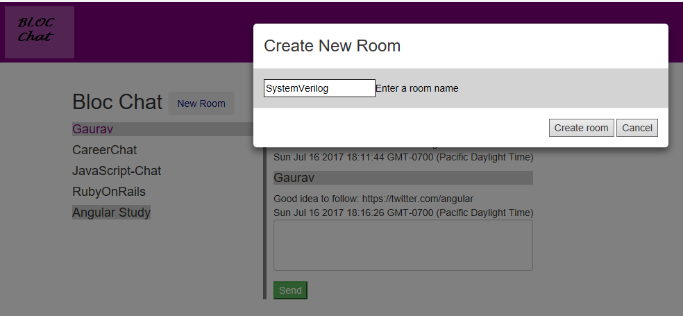 New room’s are created using $firebaseArray service and UI Bootstrap Modal to enter in the room details.